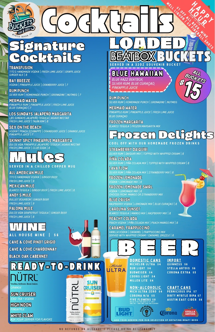 They don't call us "Buckets" for nothin'. Order your next mixed drink or frozen favorite in a bucket! That's right, we have "bucket sized" drinks to quench the thirst of even the most avid beach bum.